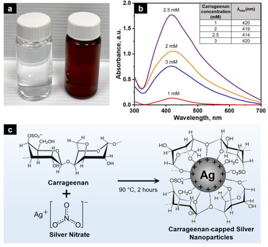 (a) Colour of the AgNO3 and carrageenan mixture before (left) and after (right) reaction at 90 °C for 2 h; (b) UV-Vis spectrum of AgNPs produced with different carrageenan concentrations and the corresponding ʎmax; (c) proposed mechanism of the green synthesis of AgNPs by carrageenan as a reducing and stabilising agent.