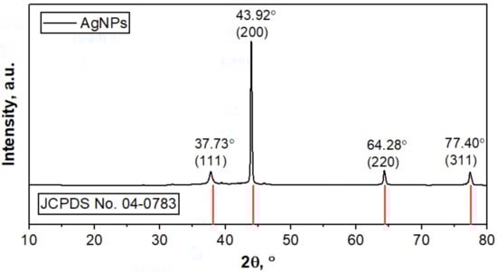 The XRD pattern of the c-AgNPs in Figure 3 shows four distinct diffraction peaks at 2θ of 37.73°, 43.92°, 64.28°, and 77.40°. These peaks can be indexed to the (111), (200), (220), and (311) crystallographic planes in accordance with Bragg’s reflection of the face-centred cubic (fcc) structure of silver, as per the database of the Joint Committee on Powder Diffraction Standards (JCPDS; card number: 04-0783) [,]. The crystalline nature of the c-AgNPs is indicated by the intense peaks, with the peak at 2θ = 37.73° being the most intense, implying the preferred orientation along the (200) lattice plane. This finding is consistent with the one reported by Sahayaraj et al. [], Jemal et al. [], and Thiurunavukkarau et al. [] for the green synthesis of AgNPs by marine algae Padina pavonica (Linn.), callus extracts of Allophylus serratus, and seaweed Sargassum polycystum, respectively. Based on Scherrer’s equation, the AgNPs’ crystallite size was determined to be 46.5 nm.