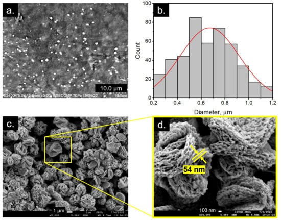Morphological analysis of the AgNPs: (a,b) SEM image and the corresponding particle size distribution; (c,d) FE-SEM images at different magnifications.