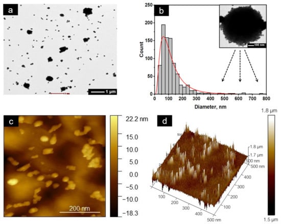 (a) TEM image of the AgNPs; (b) corresponding particle size distribution and morphology of the aggregated AgNPs; (c) 2D AFM image; (d) height analysis in 3D.