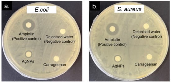 The antibacterial activity of the c-AgNPs was tested using the disk diffusion method. E. coli and S. aureus were used as representatives of Gram-negative and Gram-positive bacteria, respectively. From the agar plates shown in Figure 7, it is observed that the c-AgNPs and standard antibiotic (Ampicilin) exhibited antibacterial activity against E. coli and S. aureus, evidenced by visible zones of inhibition. Meanwhile, no inhibition zones were observed for the deionised water (negative control) and carrageenan, implying that the samples have no antibacterial activity.