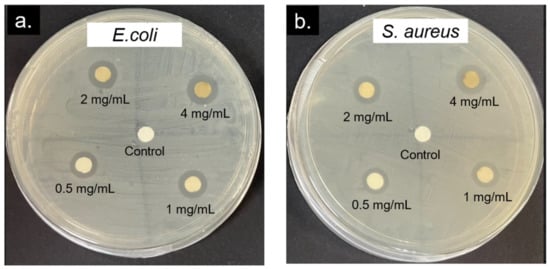 Representative agar plates of the disk diffusion assay of c-AgNPs with the concentration of 0.5–4 mg/mL against (a) E. coli and (b) S. aureus.