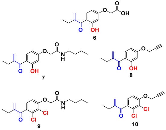 From the screening results in Table 1, compound 6 exhibited weak antiproliferative activity with an IC50 value > 10 µM, showing that the modification of the aromatic ring without modifying the carboxylic group did not improve the antiproliferative activity of the EA. Effectively, once the carboxylic acid function of the compound 6 is modified by an amide function (compound 7), an interesting antiproliferative activity was observed with an IC50 = 1.7 μM. Interestingly, its analog (compound 9), which bears two chlorines on the aromatic ring, remains inactive. These results confirm the positive impact of the hydroxyl group on the biological activity and bode well with the development of new EA analogs containing a hydroxyl group in ortho position of the Michael acceptor. Interestingly, compound 8 exhibited a very potent antiproliferative activity with an IC50 = 0.015 µM, despite the absence of the amide function []. Furthermore, in agreement with the positive effect of the substitution of the chlorine atoms by a hydroxyl group, compound 8 shows markedly improved antiproliferative activity in comparison with compound 10 (IC50 value of 0.58 µM) (Figure 2) [].