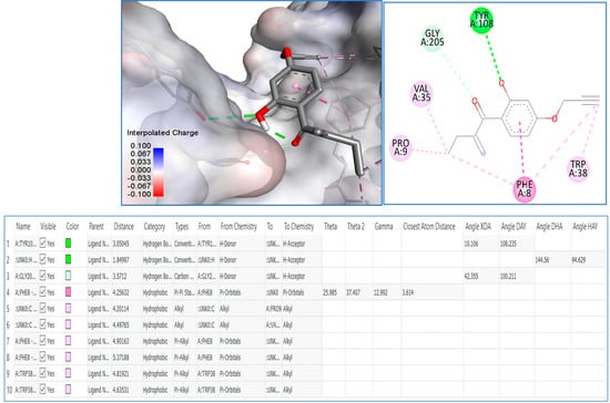 Then, we decided to achieve docking molecular studies using the best anticancer agent 8 and the glutathione S-transferase as target enzyme. With compound 8, we obtained the nine different conformations from docking analysis, from which the eighth conformer showed the best results with a total of 10 bonds, the first three being the closest to the Glutathione S-transferase active site (1.84 Å, 3.05 Å, and 3.57 Å respectively). The one at 3.05 Å from the active site showed the presence of a hydrogen bond with tyrosine at the position 108 of the pocket, as well as a weak hydrogen bond with glycine at the position 205. The rest are hydrophobic alkyl bonds, with a pi-pi stacked hydrophobic bond with phenylalanine at position 8 of the active site. The docking analysis shows that compound 8 favorably binds to the glutathione S-transferase and further explains the interesting anticancer results, especially, against the HL60 cancer cell line (Figure 3).