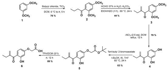 The synthetic route of the targeted EA analogue 6 is outlined in Scheme 1. In the first step, the compound 2 was prepared in 76% yield via a Friedel–Crafts reaction from 1 and butyryl chloride in the presence of titanium tetrachloride (TiCl4) as a Lewis acid in dichloromethane (DCM) []. Subsequently, the second step involves an aldol condensation reaction in the presence of formaldehyde and potassium carbonate in a mixture of ethanol/water (1/1) for 24 h to give compound 3 in 44% yield. Compound 4 as the main precursor for the synthesis of EA derivatives, was obtained under demethylation conditions using aluminum chloride (AlCl3) in anhydrous DCM in 78% yield. Next, the dihydroxyl compound 4 is involved in a Williamson-type selective nucleophilic substitution reaction in the presence of potassium iodide, tert-butyl-2-bromoacetate, and potassium tert-butoxide (t-BuOK) yielding compound 5 in 63%. It is very important to note that when ethyl ester and methyl ester were used substrates instead of tert-butyl ester 5, their hydrolysis under basic reaction conditions led to intramolecular cyclisation between the hydroxyl group and the Michael receptor. In the final step, the ester group of 5 is successfully converted into its corresponding carboxylic acid group using trifluoroacetic acid (TFA) in DCM at room temperature for 12 h to afford the target molecule 6 with a good yield (89%).