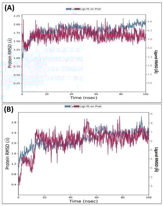 Root Mean Square Deviation: observed RMSD for Cα chain of AChE complexed with ligand MCE (A) and GSK3β complexed with ligand MCE (B) detected while executing 100 ns MD simulation.