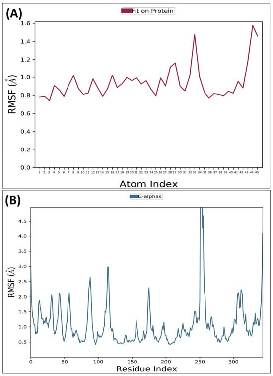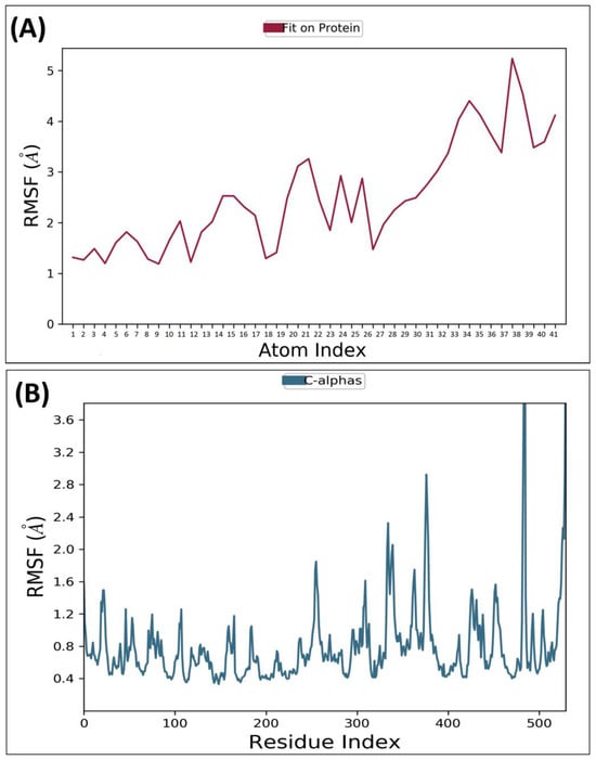 RMSF is a metric that measures the deviation of the atoms in a protein or ligand structure from their average position. It is a valuable tool in assessing the dynamics and flexibility of a protein or ligand molecule. The significance of protein RMSF lies in its ability to provide information about the relative flexibility of different parts, which can be useful in predicting protein dynamics and assessing stability. MD analysis for AChE receptor complexed with ligand MCE revealed that the protein backbone’s RMSF was within 0.4–1.4Å odds except for some terminal residues, while for MCE, it ranged from 0.5–1.5Å. RMSF for GSK3β receptor complexed with compound MCE was revealed to be within 0.5–2.0 Å, while the compound–36 average variation was found to be within 1.5–4.5Å, confirming the stability of both macromolecule and the complex ligand within the macromolecular cavity. RMSF of the AChE backbone and complexed compound MCE observed during MD analysis was depicted in Figure 4A,B, while the GSK3β receptor complexed with compound MCE was depicted in Figure 5A,B.