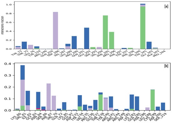 The stability of a protein–ligand complex is attributed to the formation of hydrogen bonds, hydrophobic contacts, and ionic interactions during an MD simulation. The strength of these interactions was continuously monitored throughout the simulation to evaluate the ligands’ stability in both the macromolecular complexes. During the simulation procedure, the interaction between the compound MCE and the human AChE receptor shows hydrophobic interactions with the amino acids Tyr72, Leu76, Trp286, Leu289, and Val294, whereas Ser293, Phe295, Arg296, Phe338, and Tyr341 are forming a hydrogen bond while residues Thr75, Pro290, Glu292, and Gly342 were interacting via water bridges with the compound MCE. The simulation of GSK3β complexed with compound MCE has revealed that the ligand is interacting with the macromolecular receptor via hydrophobic interactions with the amino acids Val61, Phe67, Val70, Pro136, Tyr140, and Leu188, whereas Thr138 and Cys199 are involved via a hydrogen bond. In contrast, residues Ile62, Asn64, Ser66, Gln72, Lys85, Tyr134, Val135, Glu137, Arg141, Arg144, Asp181, Cys183, Gln185, Asp201, and Ser219 were involved via formation of a water bridge with the compound MCE. Figure 6 illustrates the interactions of ligand MCE with the active residues of the human AChE receptor (a) and the GSK3β receptor (b).