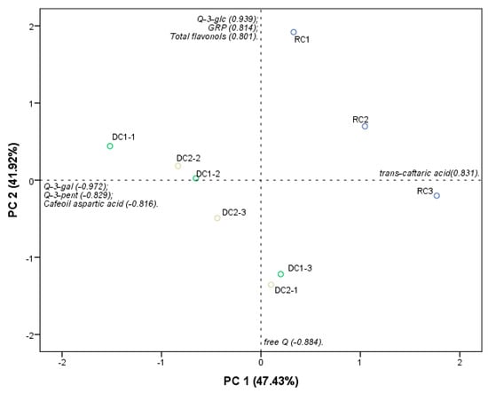 A PCA for the classes of stilbenes, flavan-3-ols, and PAs (Figure 3), differentiated the DC samples from the RC samples in PC1 (52.43%).
