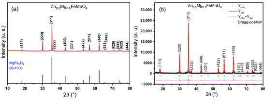 (a) X-ray powder diffraction pattern of the elaborated Zn0.5Mg0.5FeMnO4 spinel oxide compared with JCPDS card no. 88–1936 of the MgFe2O4 phase. (b) Rietveld refinement of the XRD pattern for the elaborated Zn0.5Mg0.5FeMnO4 spinel oxide with the cubic Fdm structure.