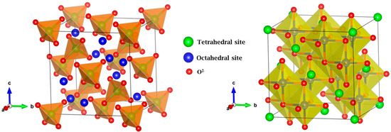 Three-dimensional crystal structure of Zn0.5Mg0.5FeMnO4 spinel oxide with the cubic Fdm structure. The Zn2+ and Mg2+ cations are located in the tetrahedral sites (green balls), Fe3+ and Mn3+ cations are located in the octahedral sites (blue balls), and the red balls represent the O2− oxygen anions.
