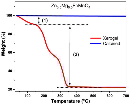 In order to understand the mechanism of the calcination of the synthesized xerogel, the xerogel sample was characterized by thermogravimetric analysis (TGA) in a wide temperature range of 20–700 °C. Figure 3 depicts the thermogravimetric curves (TG) of the synthesized xerogel and the calcined sample of Zn0.5Mg0.5FeMnO4 spinel. In the case of the xerogel sample (red curve), two weight losses take place in the temperature range from room temperature to 350 °C. The first loss is observed before 140 °C, which is due to the evaporation of the water used as a solvent during the synthesis and the physically adsorbed water on the surface. The second weight loss observed in the temperature range of 140–350 °C is attributed to the decomposition of the organic species of the citric acid (CA) associated with the elimination of nitrogen dioxide (NO2↑). Further, no weight loss is present above 350 °C. Moreover, the thermal stability of the synthesized spinel was examined by thermogravimetric analysis (TGA). For the calcined sample at 700 °C (blue curve), its TG curve demonstrates no weight loss in the whole temperature range of 20–700 °C, indicating good thermal stability of the synthesized porous Zn0.5Mg0.5FeMnO4 spinel oxide and confirming that the organic molecules of the citric acid (CA) have been completely removed after calcination at 700 °C.