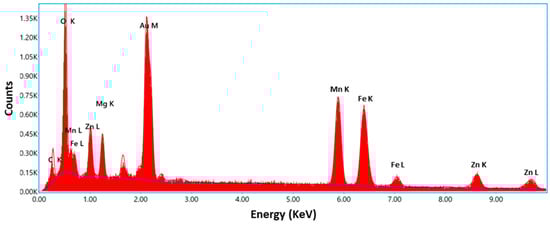 EDX spectrum of the synthesized porous Zn0.5Mg0.5FeMnO4 spinel oxide.