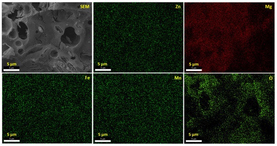 The SEM image and EDX element mapping results of Zn, Mg, Fe, Mn, and O of the synthesized porous Zn0.5Mg0.5FeMnO4 spinel oxide. Scale bar, 5 μm.