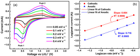 For further deep analysis of the kinetics of electrochemical lithiation/delithiation processes, the CV curves of the studied Zn0.5Mg0.5FeMnO4 anode were acquired at various scan rates ranging from 0.05 to 0.40 mV s−1, as shown in Figure 11a. The measured peak current (i) for the cathodic and anodic sweeps at various scan rates (v) was used to analyze the lithium-ion intercalation kinetics of the studied Zn0.5Mg0.5FeMnO4 anode. For the cathodic and anodic sweeps, the peak current (i, A) and the scan rates (v, mV s−1) can be related according to the Dunn relation, as expressed in Equation (6) [79,80]:
