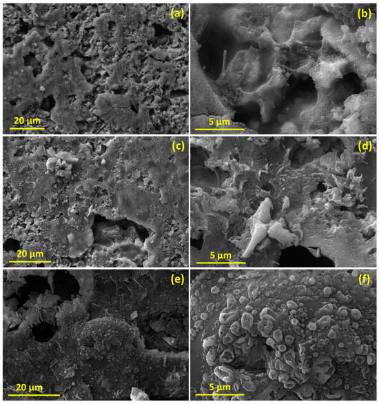 SEM images of the synthesized Zn0.5Mg0.5FeMnO4 electrodes (a,b) before cycling, (c,d) discharged after 80 cycles, and (e,f) charged after 80 cycles.