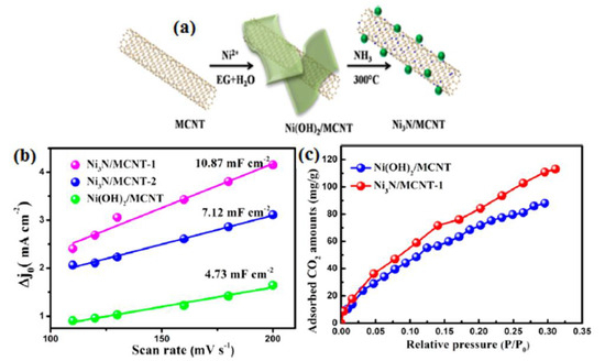 (a) Development of Ni3N/MCNT, (b) charging current densities vs. cyclic voltammetry sweep rates, and (c) CO2 adsorption isotherms for Ni(OH)2/MCNT and Ni3N/MCNT. Reprinted with permission from [27]. The American Chemical Society Washington, DC, USA, 2019.