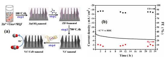 (a) Scheme of the process of N-C-CoPc NR and (b) cyclic stability test of N-C-CoPc NR at −0.7 V vs. RHE and the corresponding FEs of CO and H2. Reprinted with permission from [28]. The American Chemical Society Washington, DC, USA, 2020.