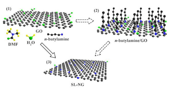 Schematic representation for the preparation of (1) single layer GO dispersion, (2) n-butylamine is adsorbed to GO layer; (3) SL-NG. Reprinted with permission from [30]. The American Chemical Society Washington, DC, USA, 2018.