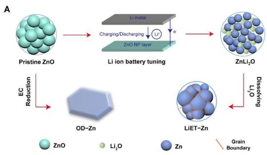 (a) Illustration depicting the structural transformation of ZnO through various reduction techniques and the voltage response during Li-assisted electrochemical tuning and (b) durability assessment of the electrocatalytic CO2 reduction reaction (CO2RR) utilizing LiET-Zn supported on a glassy carbon electrode in a long-term stability test in a CO2-saturated 0.1 M KHCO3 solution at –1.17 V vs. RHE with a loading of 0.2 mg cm−2 of LiET-Zn. Reprinted with permission from [56]. The American Chemical Society Washington, DC, USA, 2017.
