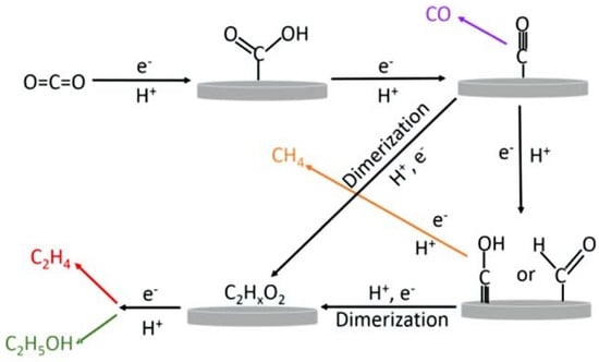 The proposed schematic representation of the electroreduction of CO2 to ethylene and ethanol on copper electrode. Reprinted with permission from [57]. The American Chemical Society Washington, DC, USA, 2015.
