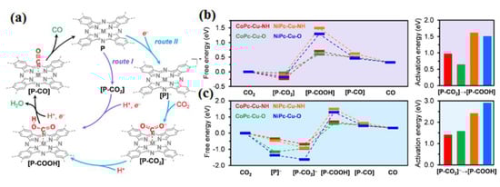 (a) Proposed catalytic mechanism for the electrochemical conversion of CO2 into CO using MP cactive sites within the framework of MPc-Cu-XH MOFs, with consideration of two distinct reaction pathways: Route I and Route II. Free energy profiles illustrating the electrochemical CO2-to-CO reduction catalyzed by CoPc-Cu-NH (in red), CoPc-Cu-O (in green), NiPc-Cu-NH (in orange), and NiPc-Cu-O (in blue) under standard conditions and an electrode potential of 0 V (relative to the standard hydrogen electrode) along the (b) Route I and (c) Route II reaction pathways. Reprinted with permission from [65]. The American Chemical Society Washington, DC, USA, 2020.