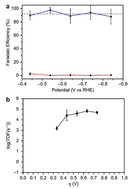 Performance of the Fe-tpyPY2Me electrocatalyst in the reduction of aqueous CO2. (a) Faradaic yields for CO production (in blue) and H2 generation (in red) under different applied potentials during a 60 min period (average values from three experiments). The mean FECO is highlighted with a dashed black line. (b) Tafel plot illustrating the catalytic activity of [Fe1]2+ derived from constant potential electrolysis (CPE) measurements in a 0.10 M NaHCO3 solution. Reprinted with permission from [76]. The American Chemical Society Washington, DC, USA, 2020.