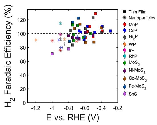 Faradaic efficiency for hydrogen (H2) generation in the context of CO2 reduction (CO2R) conditions for select transition metal phosphide and sulfide materials. Reprinted with permission from [87]. The American Chemical Society Washington, DC, USA, 2018.