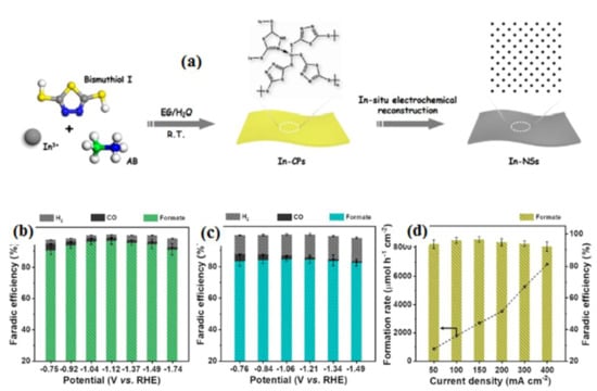 (a) Illustrative depiction outlining the process of synthesizing In-NSs from polymers and their subsequent CO2 reduction performance. Voltage-dependent Faradaic efficiencies (FEs) for formate and gaseous products for (b) In-NSs and (c) In-NPs. (d) The rate of formate product formation and FEs over In-NSs at different current densities. Reprinted with permission from [102]. The American Chemical Society Washington, DC, USA, 2023.