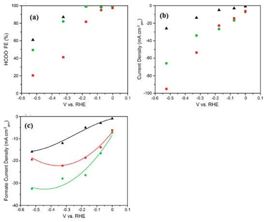 (a) HCOO− Faradaic yield in relation to the electrolysis potential for CO2 reduction reactions (CO2RR) with Pd/C (depicted as black triangles), np-PdNi (shown as green circles), and np-PdCo (represented as red squares). (b) The steady-state current for CO2RR, normalized by the electrode’s geometric area, for Pd/C (black triangles), np-PdNi (green circles), and np-PdCo (red squares). (c) Partial current density for formate (HCOO-) production with Pd/C (black triangles), np-PdNi (green circles), and np-PdCo (red squares). All experimental data were collected in a CO2-saturated 1 M KHCO3 solution. Reprinted with permission from [110]. The American Chemical Society Washington, DC, USA, 2019.