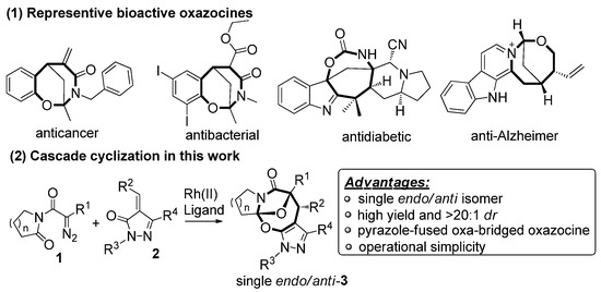 Oxazocines belong to a class of medicinally and biologically important chemical skeletons and have a wide range of biological activities such as anticancer, antibacterial, antidiabetic, and anti-Alzheimer properties [1,2] (Scheme 1(1)). Due to the variety of the significant bioactive potentials with oxazocine scaffolds, organic and medicinal chemists have created a variety of synthetic methodologies for their efficient and concise constructions [3,4,5,6,7,8]. Moreover, in this context, non-stereoselective and stereoselective cycloadditions have functioned as the crucial protocols for preparing a variety of structurally diverse and complex bridged and non-bridged oxazocines [9,10,11,12,13,14]. Importantly, elegant and powerful synthetic methodologies have appeared to prepare heterocycle-fused bridged oxazocines, but this area has witnessed slow development in recent years [15]. So, designing and exploring new synthetic protocols is urgently needed to obtain structurally new and unique oxa-bridged oxazocines fused with heterocyclic motifs.