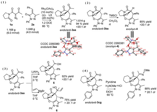 Moreover, with an aim of enriching the structural diversity and complexity of 3 products, we accomplished the crossed cascade cyclizations between substrates 1b–1e with a broad spectrum of 2 substrates, as presented in entries 18–41 (Table 4). Apparently, in this regard, all the conducted cascade cyclizations showed excellent diastereoselectivities (>20:1 dr). In the case of the chemical yields of the cascade cyclizations, they highly depended on the selected 1 and 2 substrates and ranged widely from 50% to 95%. Mostly, the crossed cascade cyclizations behaved well, and thus delivered 3 products in moderate to high chemical yields (entries 18–39 and 41). Only the cascade cyclization between 1e and 2n behaved poorly, and provided product 3ej in a quite low chemical yield (entry 40). Moreover, the oxindole-based enone 2q reacted well with diazoimide 1b, thus affording cycloadduct 3bl in excellent chemical yield and diastereoselectivity (entry 41). Meanwhile, we firmly identified the chemical structure and relative stereo-configuration of the desired product 3aa using single crystal X-ray analysis (CCDC 2260380) [45]; see details in SI) and assigned those of other title compounds by inference. In order to show the synthetic potentials of title 3 compounds, we prepared 3aa at gram scale and completed several chemical transformations of title compounds 3ba, 3aa, and 3cg, as described in Scheme 2. In the scale-up cascade cyclization, we isolated product 3aa at a chemical yield of 94% (Scheme 2(1)). Upon treatment with TMSCl in CH2Cl2 at rt, compound 3ba easily converted into its exo/syn stereoisomer 4 (CCDC 2260381) [45]; see details in Supplementary Materials) at a chemical yield of 85% (Scheme 2(2)). Furthermore, the reduction reaction of 3aa with LiAlH4 in anhydrous THF at 0 °C gave 5 at a chemical yield of 92%; and the addition reaction of 3aa with vinylmagnesium bromide in anhydrous THF at 0 °C produced 6 at a chemical yield of 75% (Scheme 2(3)). Lastly, in the presence of pyridine in EtOH at 60 °C, the condensation reaction between 3cg and H2NOMe·HCl furnished 7 at a chemical yield of 88% (Scheme 2(4)).