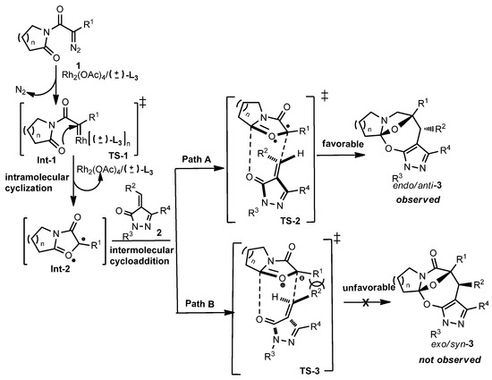 For the sake of clarifying the diastereoselective formation of product 3, we proposed the reaction mechanism for the cascade cyclization between diazoimide 1 and alkylidenepyrazolone 2, as illustrated in Scheme 3. Under the catalysis of Rh2(OAc)4 and (±)-L3, by liberating one molecule of N2, diazoimide 1 decomposes into Rh(II)-carbenoid Int-1. Then, Int-1 transforms into cyclic carbonyl ylide Int-2 through transition state TS-1. Concerning Int-2, which was formed in situ, it can conduct the cascade cyclization with alkylidenepyrazolone 2 by adopting transition states TS-2 or TS-3. In TS-3, there exists strong steric repulsion between R1 and R2 motifs; in contrast, TS-2 fully avoids this kind of unfavorable interaction. So, TS-2 is thermodynamically more stable than TS-3 and mainly accounts for the formation of single endo/anti-3.