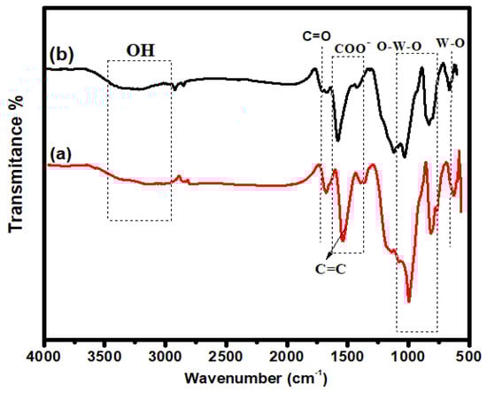 FTIR spectra: (a) FeWO4/GO; (b) I-FeWO4/GO.
