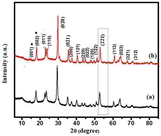 XRD spectra: (a) FeWO4/GO; (b) I-FeWO4/GO.