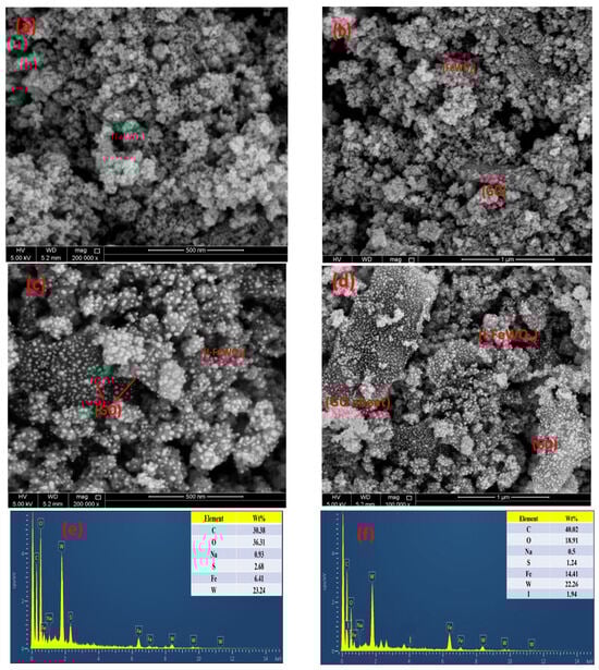 SEM images of FeWO4-GO (a,b) and I-FeWO4/GO (c,d) and EDX images of (e) FeWO4−GO and (f) I-FeWO4/GO.