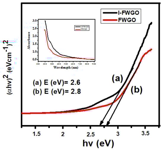 In this composite, the bandgap of FeWO4/GO was 2.8 eV, which is larger than the bandgap of I-FWGO (2.6 eV), as shown in Figure 4. Iodine was present at the interstice spaces of the FeWO4/GO composite. The doped composite’s bandgap was reduced due to reactive iodine species in the interstitial matrix of FeWO4/GO, thereby enhancing the surface area. The photocatalytic activity of I-FWGO was more significant than FeWO4/GO due to the easy excitation of electrons in the conduction band and the suppression of the charge carrier’s recombination.