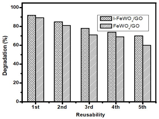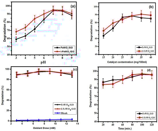 Under the following conditions, the oxidant (H2O2) amount was optimized: MB solution (30 ppm); pH = 7; and catalyst dose = 30 mg/100 mL for FeWO4/GO and 35 mg/100 mL for I-FWGO. The degradation of MB increased successively with oxidant dose (Figure 5c). The optimum oxidant value was 7 mM for I-doped FeWO4/GO and 9 mM for FeWO4/GO. The reduction of H2O2 to OH• occurs by accepting electrons [34]. In photodegradation, the MB dye is effectively degraded by using OH• radicals. Furthermore, OH• radicals capture photoexcited electrons from the conduction band, and as a result, the recombination time increases.