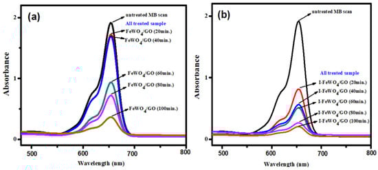 MB UV–Vis spectral changes during degradation over time using (a) FeWO4/GO and (b) I-FeWO4/GO.