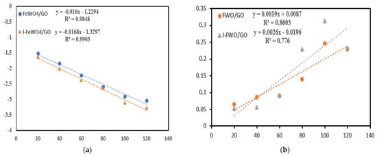 where Co is the initial dye concentration and Ct is the cncentration of MB at a time “t”. For first- and second-order reaction kinetics, a linear response was observed from the plot of time (T) versus “ln (Ct/Co)” and “1/Ct−1/Co”. The “R2” and “k” values are shown in Table 1. The values of “R2” and “k” were more significant for I-I-FeWO4/GO, indicating that iodine doping improved the catalytic activity (Figure 7).