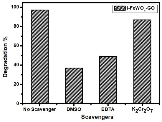 Reactive species such as electron (e−), hole (h+), and hydroxyl radicals () play a key role in the photocatalytic activity. The efficiency of the radicals involved in the degradation process can be investigated by using radical scavenging species. For this purpose, 5 mM radical scavengers were used. The radical scavenger K2Cr2O7 (potassium dichromate) was used for e−, EDTA (ethylenediaminetetraacetate) was used for h+, and DMSO (dimethyl sulfoxide) was used for as shown in Figure 9. After adding a precise number of these scavengers under optimal working conditions, the dye solution with the catalyst was exposed to sunlight. The results show a drastic reduction in dye solution degradation using DMSO. The degradation was decreased from 97% to 37% by using DMSO for I-I-FeWO4/GO. Similarly, the contribution of electrons and hole scavengers also reduced the degradation.