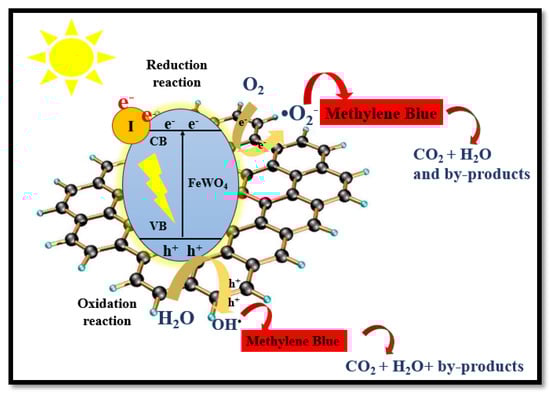 Electrons and holes are the reactive oxygen species that initiate the degradation process. When sunlight falls on the I-FeWO4/GO surface, the electrons are rapidly excited from the VB toward the CB due to iodine doping, which reduces the bandgap of FeWO4. These photoexcited electrons move toward the CB of graphene oxide, and holes (h+) remain in the VB of FeWO4. In graphene oxide, h+ moves toward the VB of FeWO4. Fe2+ ions react with H2O2 and thus generate hydroxyl radicals and change into Fe3+ ions. The recombination time of the charge carrier is enhanced by receiving electrons from the conduction band by Fe3+. Therefore, the generation of photo-Fenton reagents leads to a high degradation rate at neutral pH. This photogenerated h+ reacts with H2O2, thus producing hydroxyl radicals. Additionally, many protons are present, which can react with and generate , which is used for degradation. The electron (e−) in the CB oxidizes H2O2 to generate as swn in Figure 10. The mechanism is as follows: