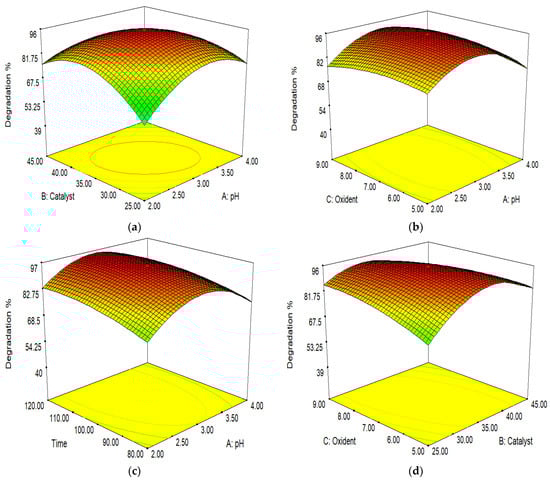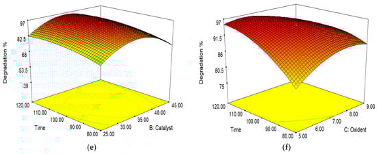 The interaction of the time parameter and the catalyst load is shown in Figure 11e. The catalytic activity was enhanced by increasing the concentration of the catalyst due to many active sites. If the catalyst concentration increased too much, degradation would decrease due to the agglomeration of the catalyst; hence, the surface area would be reduced. Initially, the degradation rate was low due to the production of resistant species. These intermediate products radially degraded with time [40].