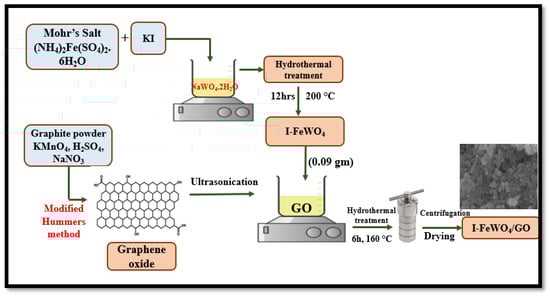 A co-precipitation-assisted hydrothermal method was used to synthesize the novel I-FeWO4/GO (I-FWGO). For sonication, 0.09 g of iodine-doped iron tungstate was dissolved into 240 mL of deionized water. Similarly, about 0.18 g of graphene oxide was dispersed into 50 mL of deionized water, and the solutions were mixed using sonication at room temperature for 30 min. The solutions were poured into a 500 mL autoclave and placed into an oven at 160 °C for 6 h. Later, it was cooled down to room temperature and then washed with water and ethanol. Finally, the samples at 80 °C were dried for 12 h in the oven. The visual explanation of the synthesis process is shown in Figure 12.