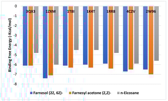 Binding free energy values were calculated using the molecular docking of ligands (farnesol, farnesyl acetone, and eicosane) and receptors (3QX3, 1ZXM, 1T8I, 1K4T, 1RR8, 4C2V, and 2W96).