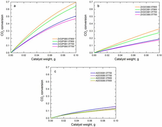 CO2 conversion of Ni-based catalysts for all syngas compositions: (a) Ni/ZrO2-P; (b) Ni/ZrO2-C; (c) commercial Al2O3.