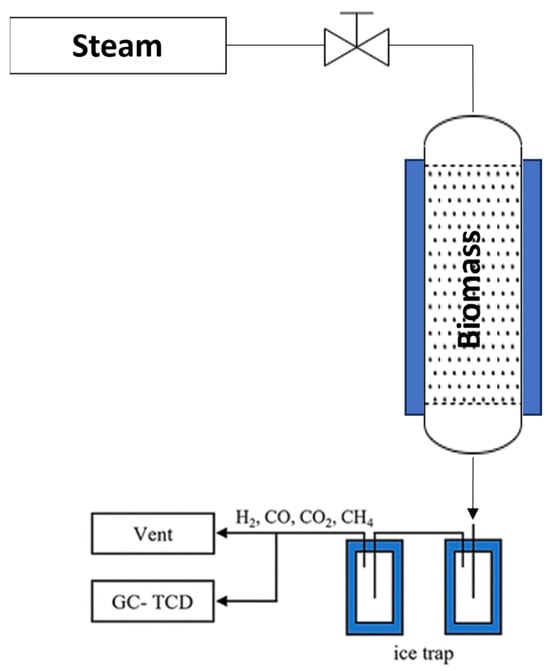 Gasification is the thermo-chemical conversion of a carbonaceous fuel, and it is characterized as an endothermic process, meaning it requires a heat source [17]. Therefore, it is performed at high temperatures typically ranging from 500 to 1400 °C and can take place under atmospheric or elevated pressures, reaching up to 33 bar [18]. Gasifiers traditionally operate within distinct configurations, including fixed-bed, fluidized-bed, and moving-bed systems [19]. This process involves a partial fuel oxidation by using an oxidizing agent, which could be oxygen, air, steam, or mixtures of these [20,21]. Although using air as a gasifying agent is cheap, the syngas dilution by the N2 presence can lead to a reduction in its high heating value as well as a decrease in the overall efficiency of the gasification process [22]. Utilizing steam as the gasifying agent leads to the formation of a syngas characterized by its elevated calorific value, typically ranging from 10 to 15 MJ N/m3, and a hydrogen-rich composition [21]. Additionally, Ref. [23] highlights the outcomes of syngas generation through biomass gasification with steam. This work demonstrates a yield enhancing of both hydrogen and carbon dioxide while also presenting a notably higher calorific value in comparison to gasification using oxygen or air as gasifying agents. Therefore, steam was selected as gasifying agent in the present study.