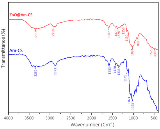 Figure 1 displays the IR spectra of pristine Am-CS and ZnO@Am-CS bio-nanocomposite membranes. The observed absorption band at 3280 cm−1 in the case of Am-CS signifies the stretching vibration of the -NH2 and -OH groups [28,29]. This band was shifted after the formation of the ZnO@Am-CS bio-nanocomposite to a higher wavenumber of 3357 cm−1. Also, the stretching vibration bands at 2919 and 2973 cm−1 are associated with the C-H aliphatic [30]. Moreover, the absorption bands at 1618 and 1583 cm−1 are related to C=O stretching of the secondary amide [8]. The detected bands at 1363 and 1376.14 cm−1 correspond to -C=N- stretching and C-H symmetric bending of the CH2 group on the polysaccharide skeleton. Further, the skeletal vibrations at 892 and 1023 cm−1 correspond to the C-C, C-O, and C-O-C glycosidic bonds [10]. Notably, the observed absorption peaks at approximately 498–600 cm−1 in the case of ZnO@Am-CS bio-nanocomposite are assigned to ZnO vibrations [31], which confirm the successful impregnation of ZnONPs in the Am-CS membrane matrix.