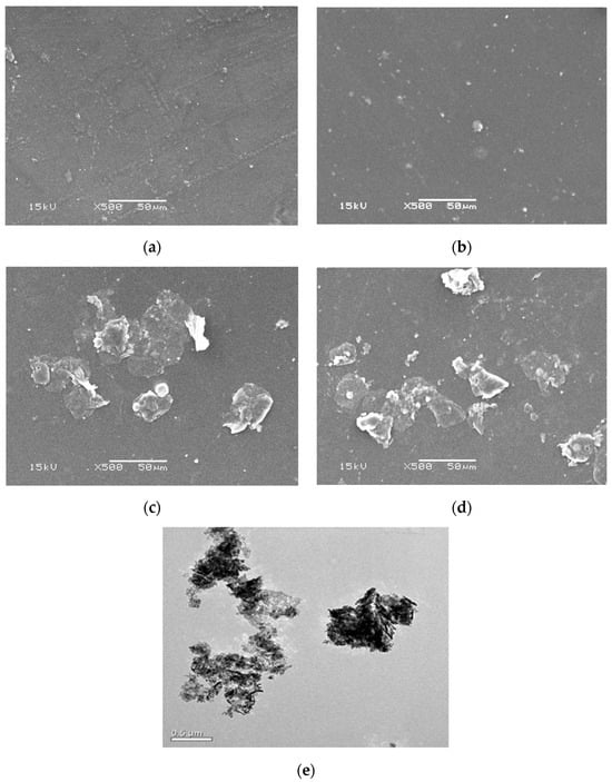 SEM analysis was used to detect the morphological variations induced by the integration of ZnONPs into the membrane matrix of the Am-CS. The SEM image of the native Am-CS membrane (Figure 2a) displayed a relatively coarse and heterogeneous surface [8]. The developed ZnO@Am-CS bio-nanocomposite membranes (Figure 2b–d) showed a rougher surface containing small particles, probably due to the distributed ZnONPs along the Am-CS matrix. In addition, increasing the ZnONP ratio from 0.025% to 0.1% significantly increased the surface roughness, which could be attributed to the polarity difference between them. Likewise, the generated interactions between the Am-CS and the ZnONPs affected the surface morphology of the final bio-nanocomposite membranes. Additionally, TEM analysis (Figure 2e) was performed to gain more details regarding the crystallographic and morphological properties of ZnONPs with high spatial resolution. The ZnONPs displayed a lattice structure with clustered spheroids, which existed in aggregated forms with a slight variation in thickness. This could be ascribed to the high electron density of the ZNPs and the extensive hydrogen bonding between the NPs [32,33,34,35].