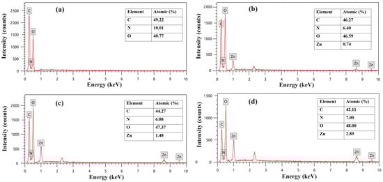 Additionally, energy dispersive X-ray (EDX) analysis was performed to investigate the elemental composition of the developed membranes, as shown in Figure 3. The results verify that the pure Am-CS membrane (Figure 3a) was composed of C, N, and O with atomic percentages of 49.22, 10.01, and 40.77%, respectively. The incorporation of ZnONPs in the membrane matrix was verified by the existence of a Zn peak in the spectra, while the atomic percentage of Zn was increased from 0.74 to 2.98% with an increasing ZnONP ratio from 0.025 to 0.1% in the composite membrane (Figure 3b–d). Similar observations have been reported by other researchers [36]. These findings infer the successful formation of ZnO@Am-CS bio-nanocomposite membranes.